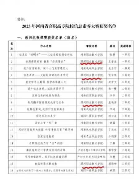 近日,2023年河南省高职高专院校信息素养大赛成绩揭晓。此次大赛中,全省教师组微课赛共计获奖18名,我系教师胡荣柳荣获三等奖,并在Bevictor伟德2023年信息素养大赛中荣获二等奖。我系员工马国梁在校园读书之星活动中荣获全校十大读书之星。