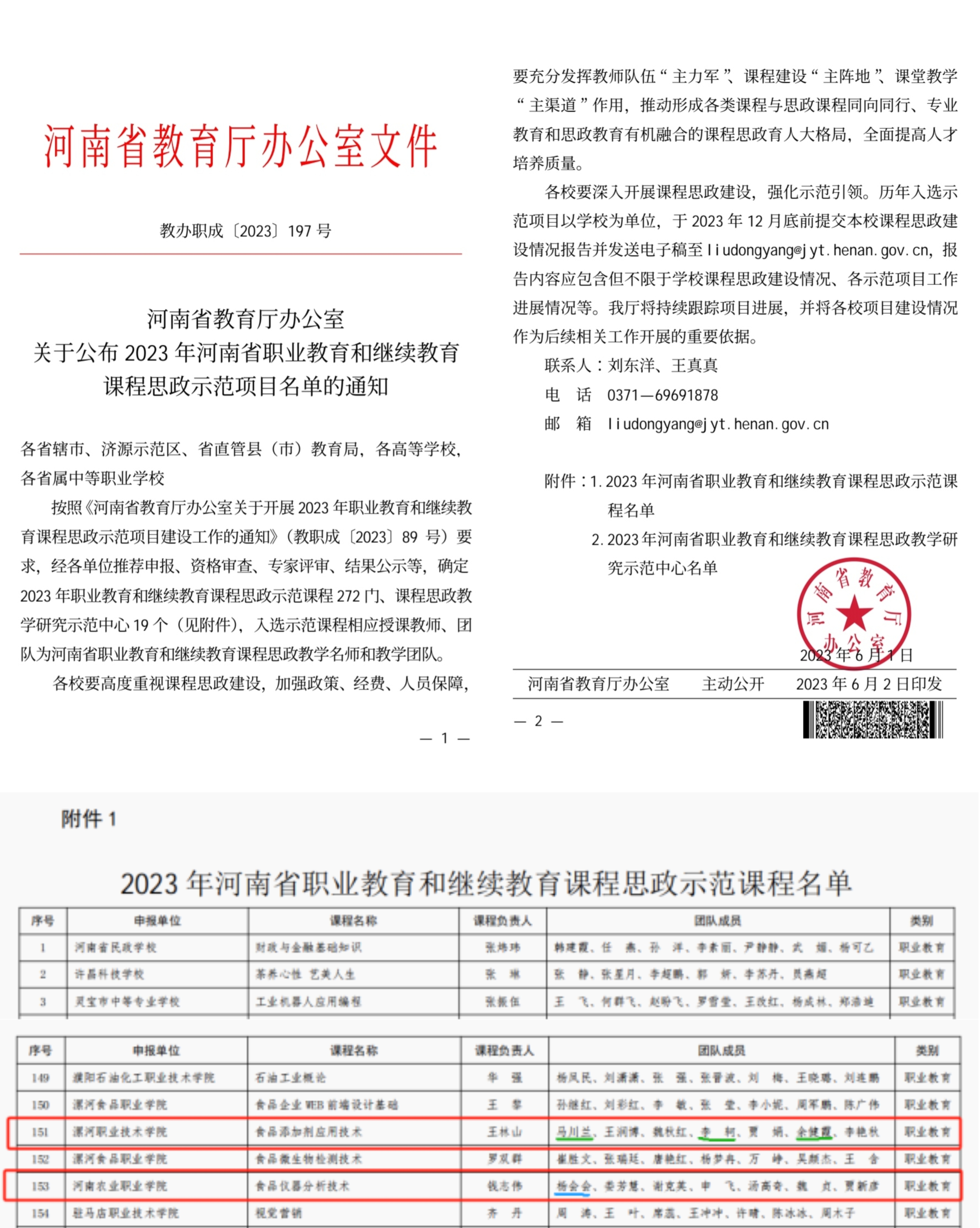 3.2023《食品添加剂应用技术》和《食品仪器分析技术》获得河南省课程思政示范项目