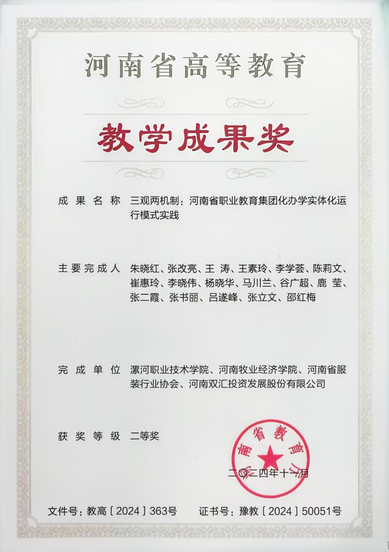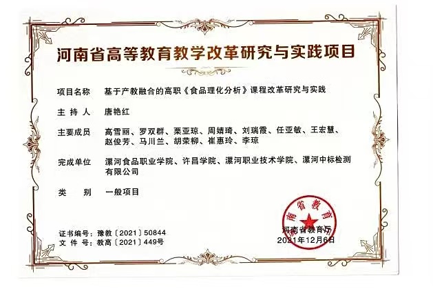 参编杨会会老师参加的河南省高等公司产品成果《基于“1+X”证书的食品类专业人才培养模式研究与实践》获得省级二等奖。